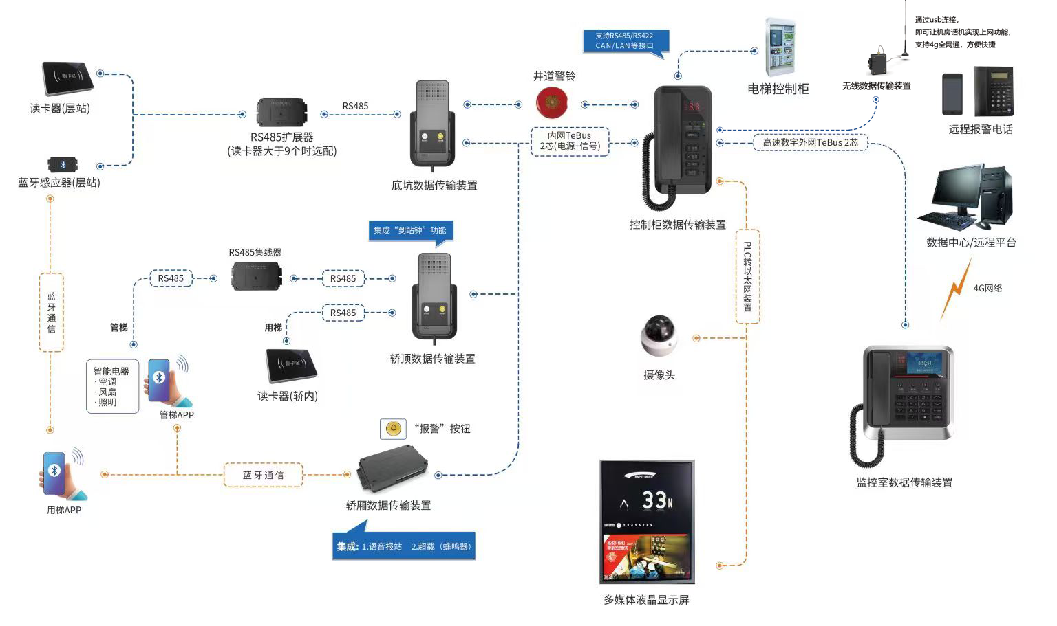一体机:数字化物联网一体机云梯系统,实现对讲、本地监测、远程监测、IC卡门禁、语音报站等电梯非控制类各种数字设备功能集成化、数字化和智能化。