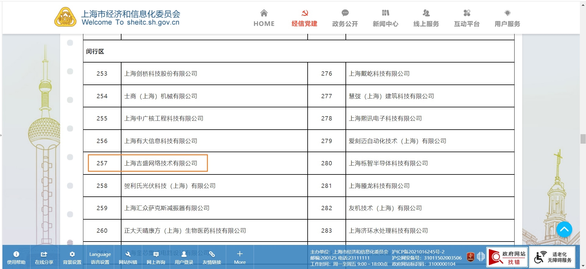 2023年10月16日,上海市经济和信息化委员会公示了2023年上海市专精特新中小企业(第三批)企业名单,上海吉盛网络技术有限公司成功入选(闵行区257),荣获2023年上海市专精特新中小企业认定。